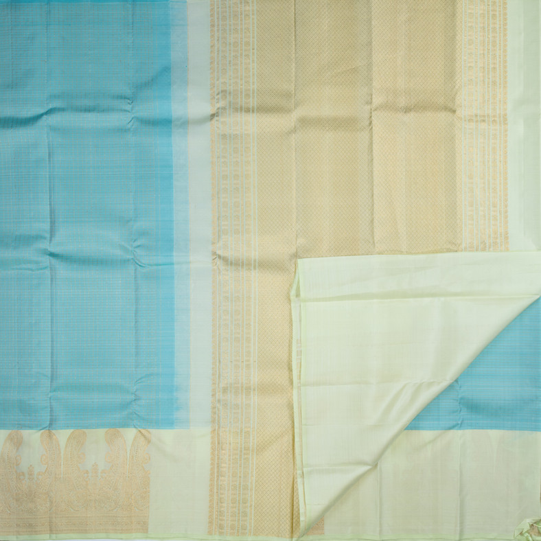 Sea Green color pure Kanchipuram handloom silk saree , featuring gold zari small check pattern around body, pastal green one side border with gold motifs around border, contrast pallu with gold zari, pastal green plan blouse. Silk mark certified.